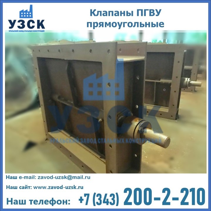 Прямоугольный клапан ПГВУ имеет прямоугольную или квадратную форму, по основному сечению конструкции, на которую устанавливается клапан. Для изготовления в Уральске применяются сталь или чугун, в зависимости от модели. Внутри клапана имеется запорный элемент, передвигающийся параллельно общему потоку движения среды. Шибер ПГВУ имеет такую же форму, как и основное сечение. Перемещение створки происходит благодаря возвратно-поступательным движениям.