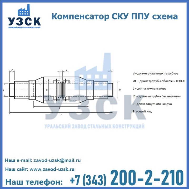 Уральский Завод Стальных Конструкций в Уральске предлагает готовые изделия, а также вы можете приобрести компенсатор СКУ ППУ под заказ. Наш завод располагает всем необходимым оборудованием для производства нестандартных позиций компенсатора СКУ в ППУ изоляции. Завод «УЗСК» предлагает большой выбор качественных и надежных компенсаторов СКУ ППУ, полностью укомплектованных и готовых к эксплуатации. Мы гарантируем соответствие нашей продукции всем требованиям ГОСТ и ТУ, износостойкость и высокую производительность. Наше предприятие поставляет и производит оборудование, имеющее длительную гарантию и большой эксплуатационный ресурс. Если вы хотите заказать сильфонные компенсационные устройства СКУ ППУ или другое оборудование с доставкой, наши специалисты помогут рассчитать стоимость транспортных расходов и организуют доставку товара. Вы можете оформить заказ на продукцию на нашем сайте, для этого достаточно заполнить форму обратной связи.